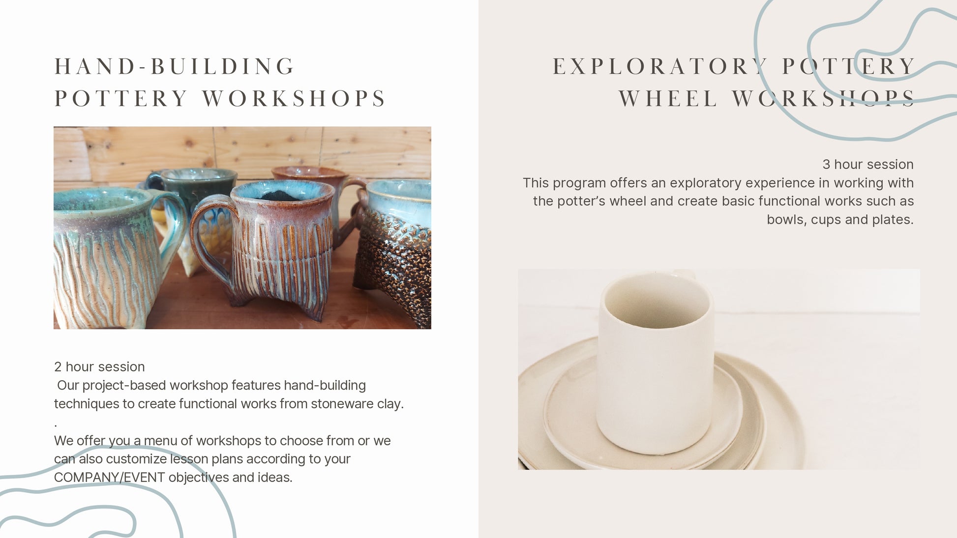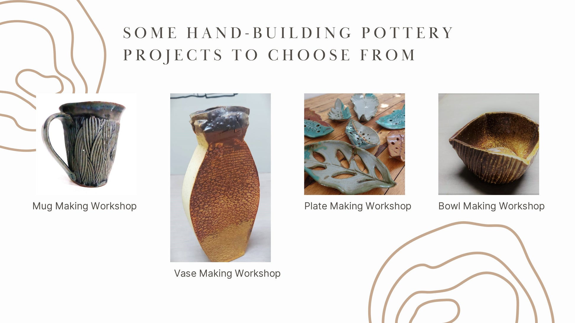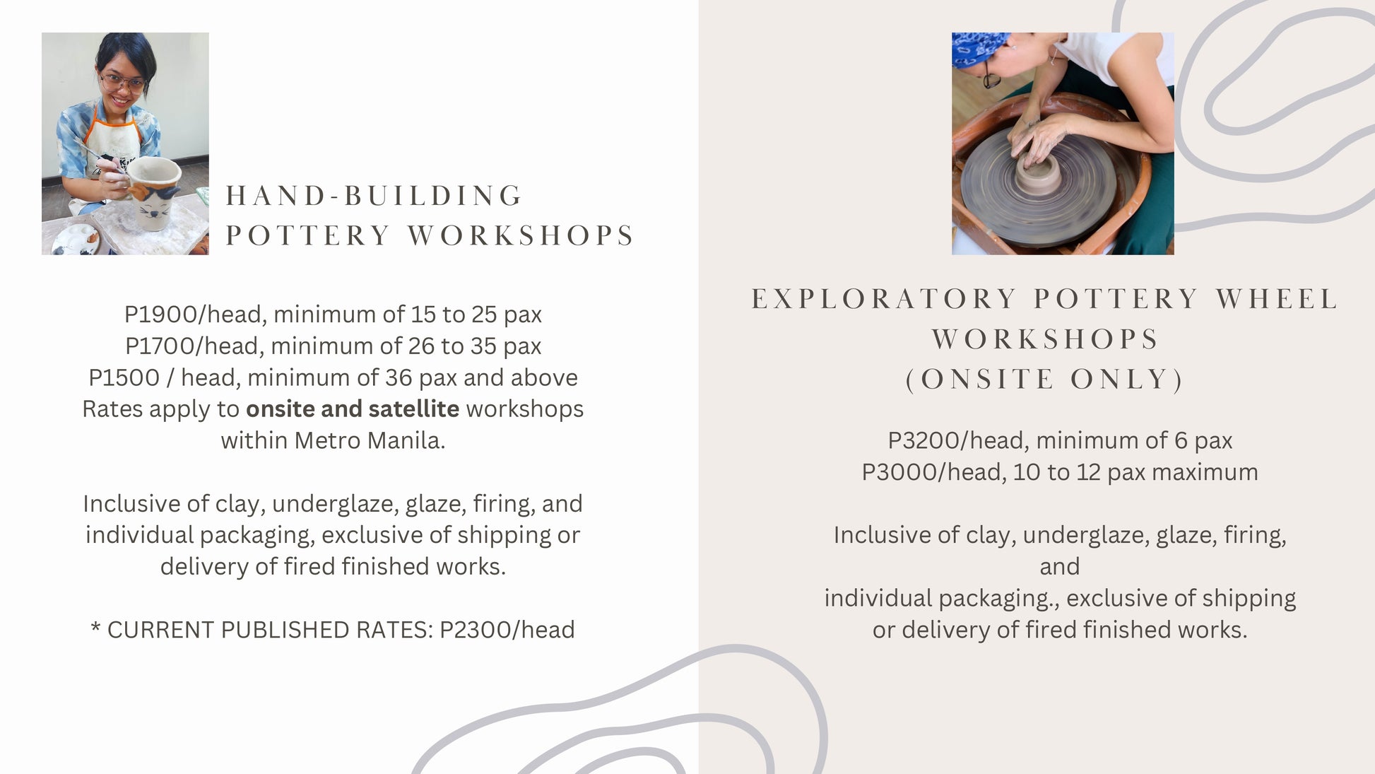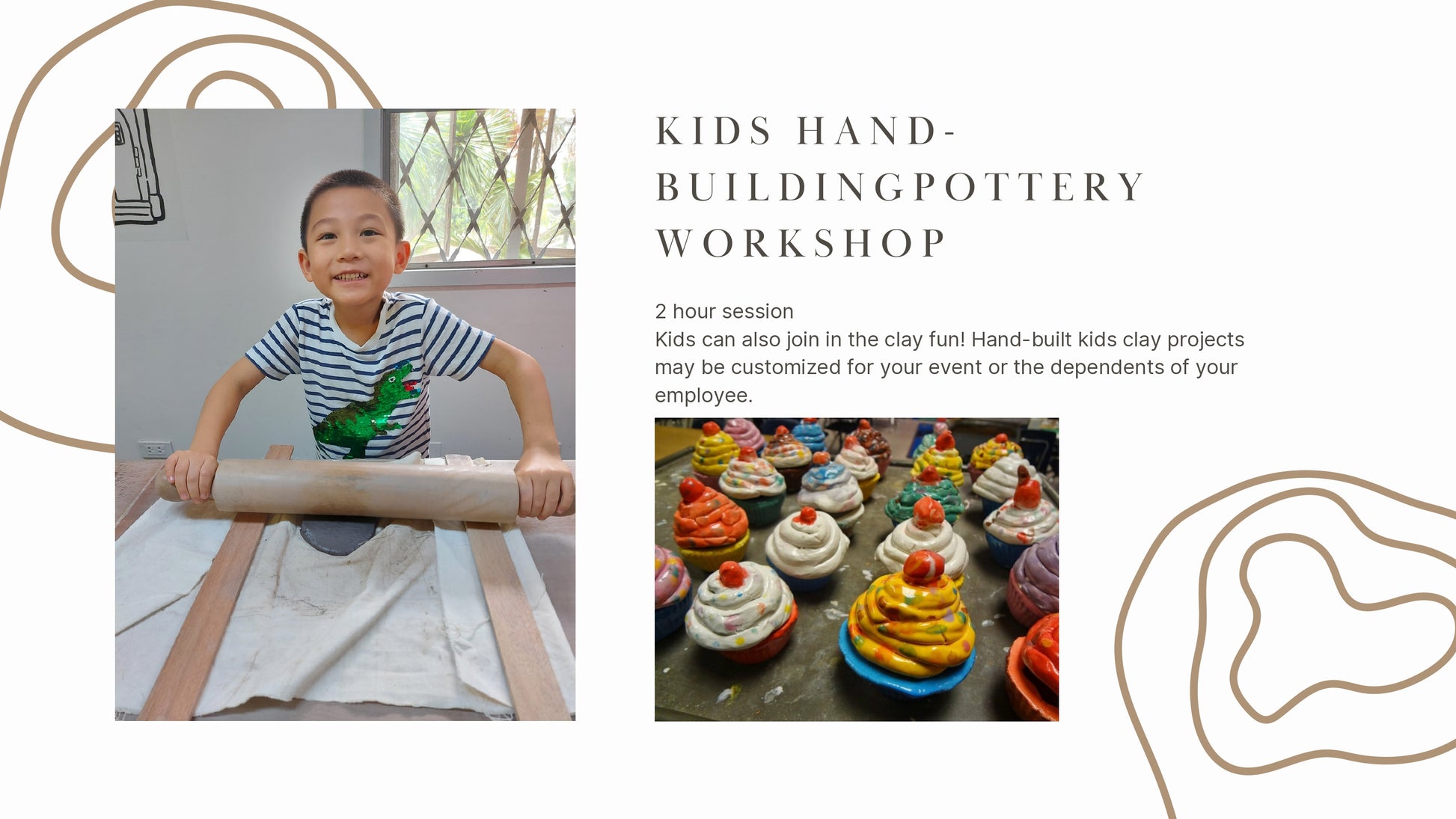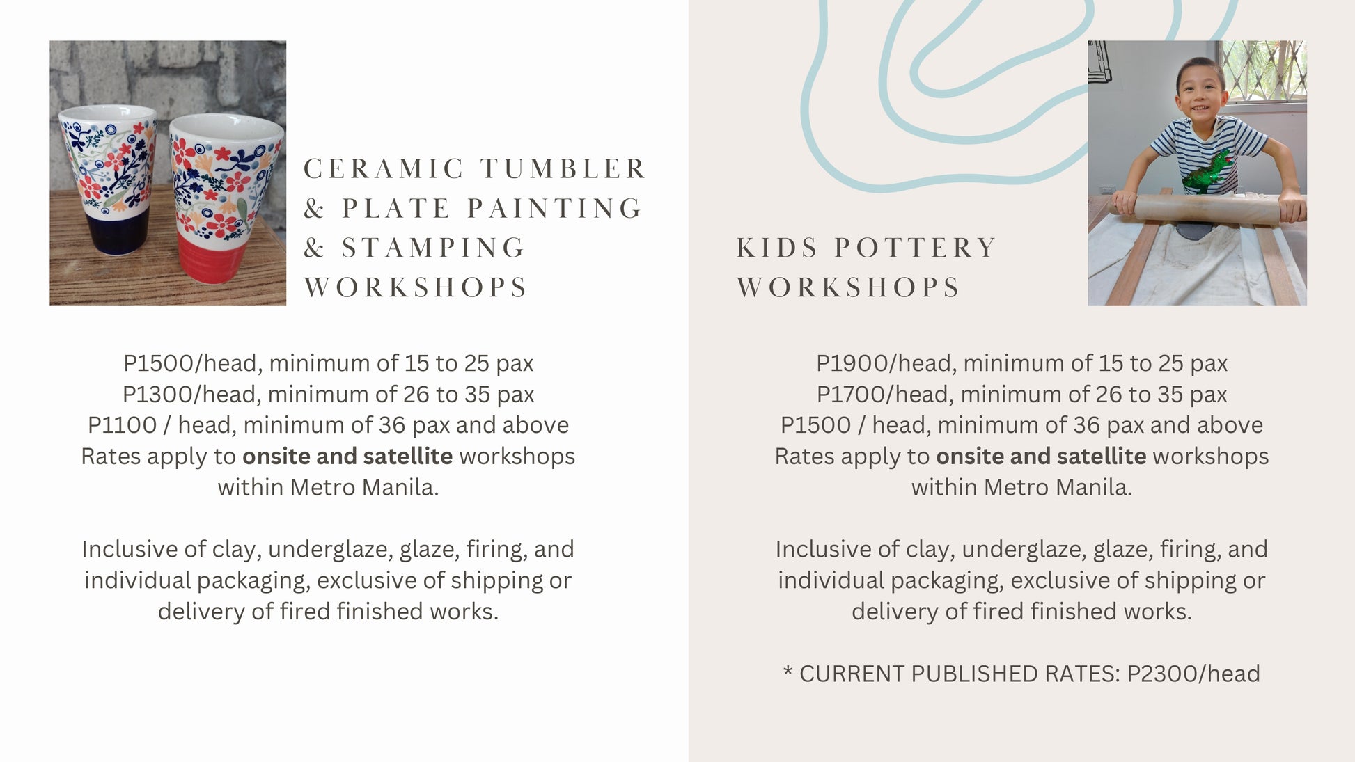 Tahanan brings our quality pottery painting and hand-building pottery programs to your workplace, school, or event. We can custom-design programs for team building, for employees and dependents of your employees, for projects that reinforce special school lessons, and for seasonal events for malls, and clubs, such as Halloween, Valentine's, Christmas, etc. Click & fill out the form or message us on any of our numbers and messaging platforms for our special offer sheet.